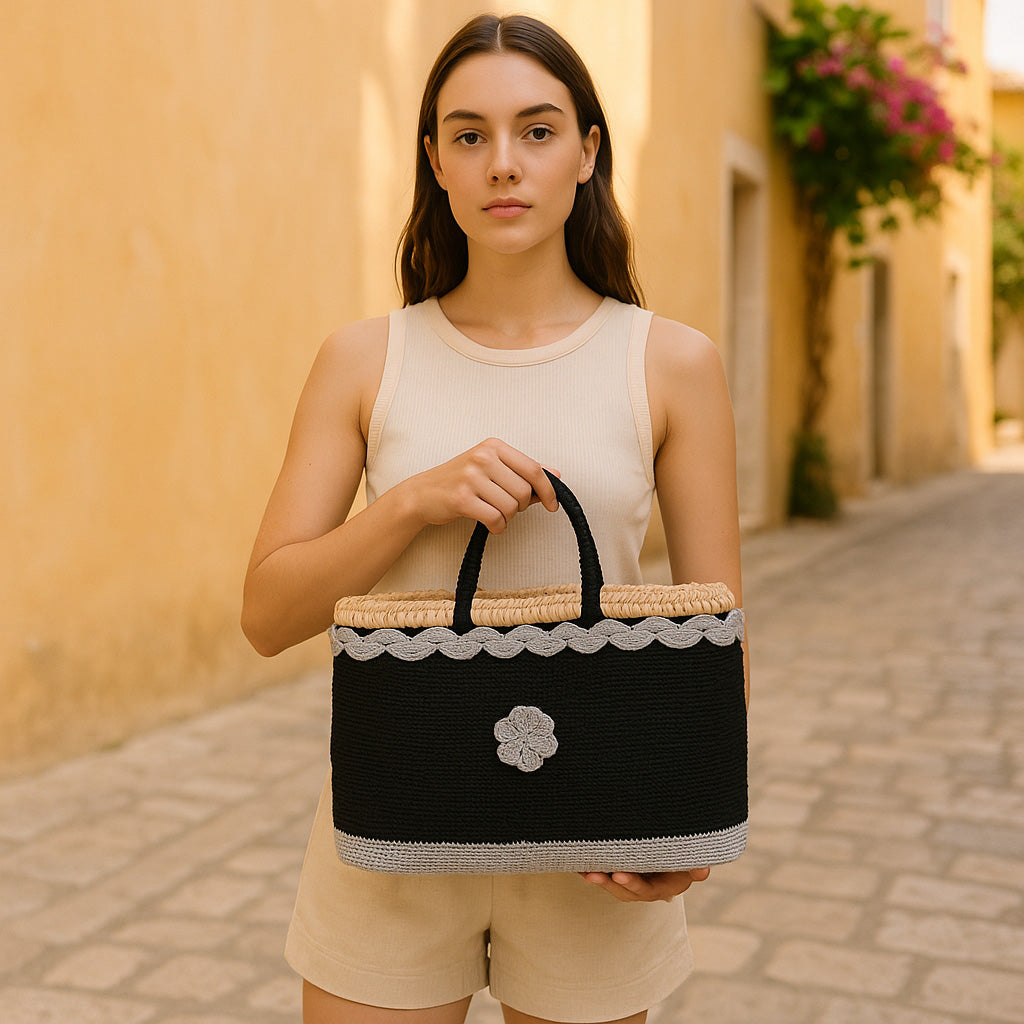 Embrace the cozy charm of autumn with this handcrafted black crochet basket, designed to pair perfectly with warm, earthy seasonal styles. Featuring soft gray trim and a central flower motif, this artisanal tote blends elegance with rustic texture. The natural woven top edge adds a handcrafted touch inspired by Mediterranean craftsmanship, ideal for crisp fall walks, weekend markets, or layered seasonal outfits.